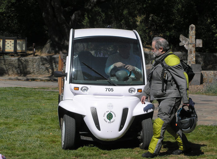 flash gets a ride in the electric cart provided by the park service