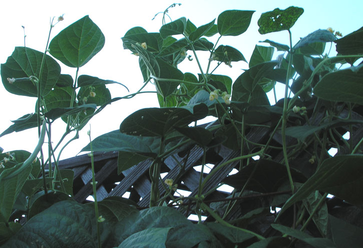 The green beans have outgrown their wire trellis and are reaching for the sky.