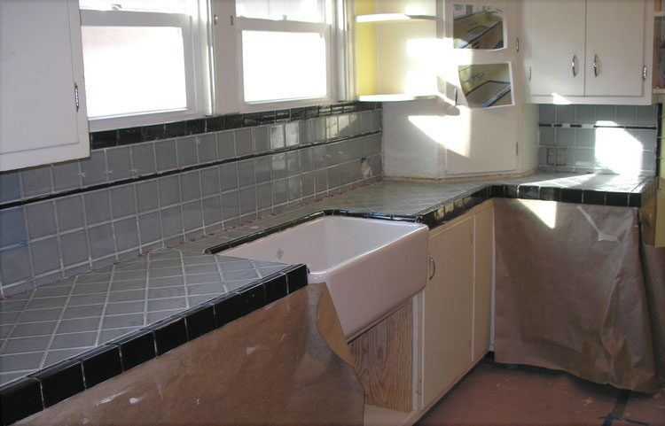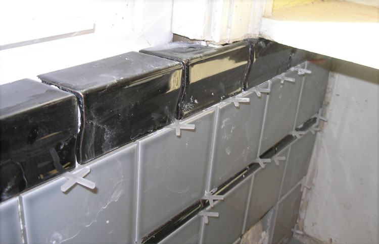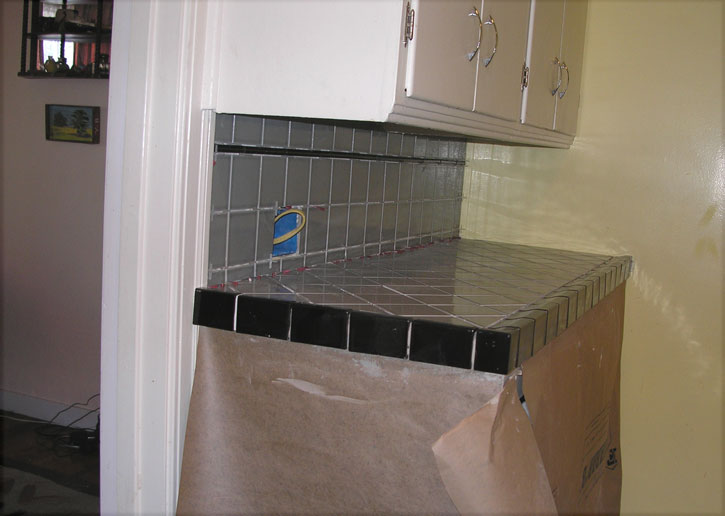 A close-up of the tile work where the backsplash wraps over and