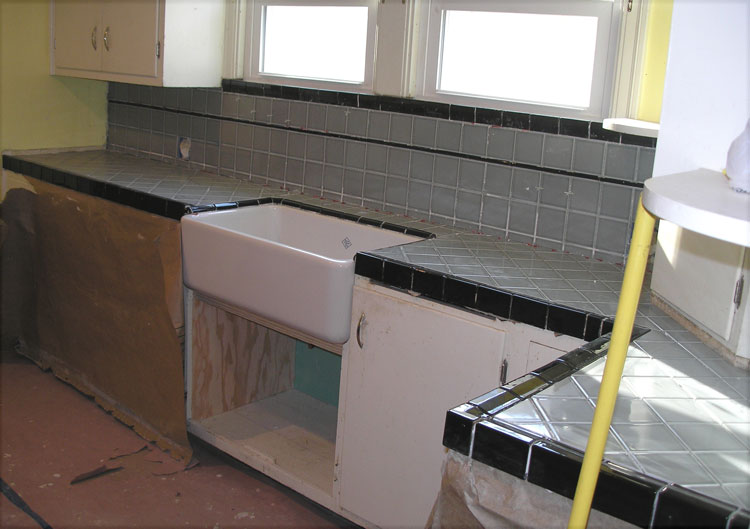 The west wall of cabinets with backsplash in place.