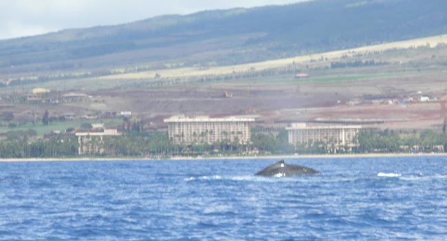 A humpback whale surfaces in the waters off Maui's Kaanapali Beach.