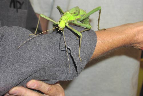 The mantis creeps along David's sleeve.