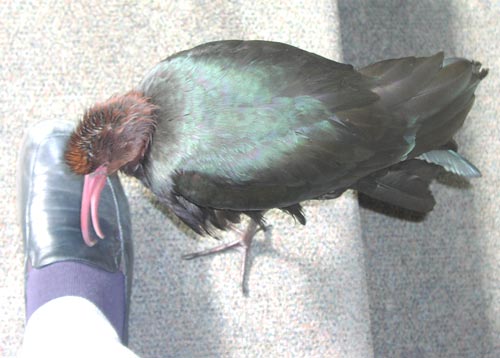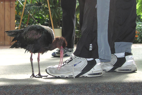 The shoe-crazy bird pecks away at Cynthia's slip-on.