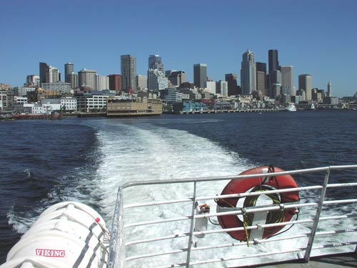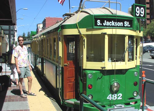 We flew to Seattle, then took the hydroplane over to the island of Victoria. At left, David, about to board the Seattle trolley that will drop us off dockside at the Victoria Clipper. |