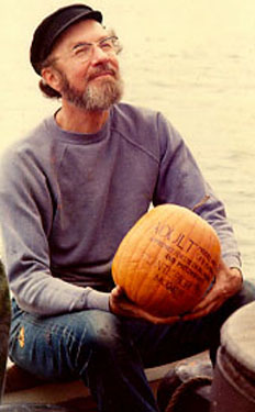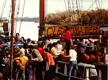 Pete, singing while we load pumpkins on Clearwater for the annual Pumpkin Sale down the Hudson River, October,1973. I am in the red shirt on the far right.