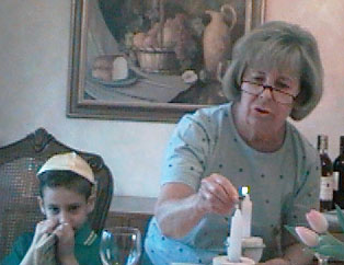 The best thing about any seder, of course, is starting it. Here, Aunt Janet lights the candles while Jeremy looks on. It was Jeremy's good fortune (or lack thereof) to be sitting directly opposite me, whereas his younger brother Alex, was right next to me, carefully balancing the kiddush cup he made in school. In a tribute to both of them, here is Jeremy reading the Hagadah that Alex put together in his Hebrew School class. At that point, I ran out of photo slots in the camera, so you have to imagine the rest.