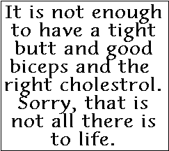 Health certainly is not the fifty year old movie star trying to look twenty. That is a beautiful biological vehicle but it's not health necessarily. It is not enough to have a tight butt and good biceps and the right cholesterol. Sorry, that is not all there is to life.