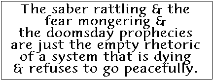 Let go of the fear. Let go of the digging in with your heels. Move forward. We know how to do it. It can be done. The saber rattling and the fear mongering and the doomsday prophecies are just the empty rhetoric of a system that is dying and refuses to go peacefully.