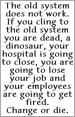 If there is any message for hospital executives, it is to be bold. The old system does not work. If you cling to the old system you are dead, a dinosaur, your hospital is going to close, you are going to lose your job and your employees are going to get fired. Change or die.