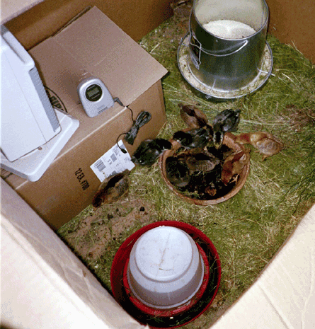 We took the babies home and put them in a big box we happened to have in our greenhouse with their food, water, and a heater to keep them warm. I put a thermometer in it so we could monitor how warm it was for them. When they got a bit bigger we cut one side away and put a wire fence around the box to keep them in, but give them more room to play in. Then when they outgrew the box and started flying over the fence, we moved them to what had been an old cattery with a secure fence to keep them safe. Their permanent home is still a future project, but they seem happy enough with what they have for the time being. At night they come back from exploring around the property and roust in the rafters and boxes near the ceiling.