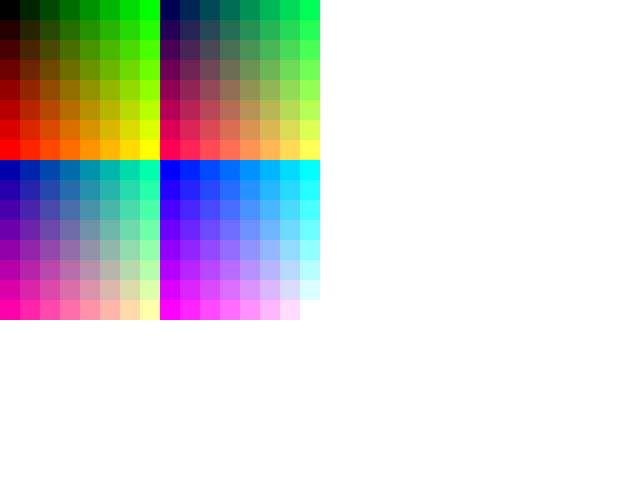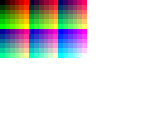 Each large sub-rectangle has a different Blue value. Within a sub-rectangle, each row of little squares has a different Green value and each column has a different Red value. Color values increase from left to right and from top to bottom. Colors are not dithered.