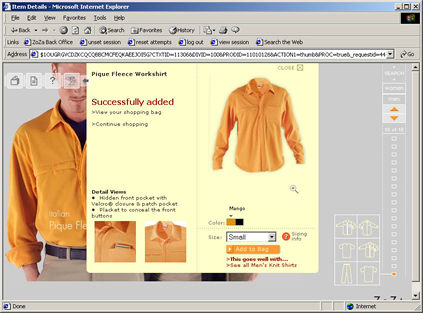 The visitor has added an item to the cart. We had a multi-state logic in place here - the item was in stock (as near as we could tell, thank you Client Logic), the item was Out of Stock but was going to be reordered, or the item was at End-Of-Life and was not going to be reordered. This logic bubbled up through the presentation in the following way: if the item was in stock the Visitor received the message you see here. If the item was out of stock but still in production the Visitor received a message asking if they would like to receive an email when the item came back into stock. If the specific SKU was not going to be replace we gave the Visitor a message indicating that the specific Size or Color was not available, and would they like another? Finally if there was just no more of these things the item would not have any way of reaching it! Meaning no Search, no Browse, no Cross-sell links, etc. Making this happen was a combination of both automatic and manual processes. If those processes failed we had a 'product 404' page.