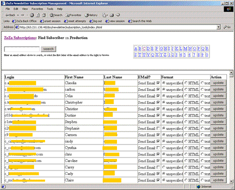Here we see the results of browsing the 'C' customers. While I wrote cron-based Java email reading programs, which would parse incoming emails for subscription format/unsubscibe requests, we also had a lot of people just call up. I put the update button next to each Customer so the user wouldn't have to move their mouse too far down the page.