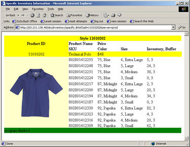 A Detail page for the product. This page was actually the target of a number of different links throught our Backoffice system. It was also bookmarked quite a bit by the merchants and designers. (We added 'program finished' to some pages as we were often pestered by people trying to find out if all the page was loaded.) Again, simple layout. |