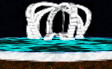 The Invisible Fountain (1993) Virtual sculpture. The shape of the arms of the fountain were determined from the accented syllables in rhyming lines of a stanza in a poem on the Narcissus theme by Paul Valery. The picture was produced with Form-Z, rendered with Stratavision 3D, and touched up in Photoshop. Music from the virtual environment was realized by coupled chaotic oscillators "listening" to the rhythms of the poem.
