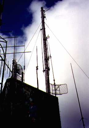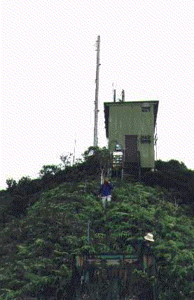 Pictured here (on the left) are Roy Richardson, Jim Barnes and John Hawthorne, all waiting below the transmitter building for the helicopter to come retrieve them from Kahili and the increasing afternoon cloud cover. As the animation shows, 2 minutes can make a difference, as the clouds began to move back in right after we called to be picked up. 20 minutes later, the clouds made helicopter access impossible until the next day. Fortunately, everyone made it out safely just in time. It is typical during the summer to find Kahili in the clouds until about 10:00 AM, and after 4:00 PM you risk being stuck until the next day. Because of the elevation (nearly 3,000 feet above sea level), the winds and clouds are unpredictable. The weather in Lihue can be sunny and bright, while Kahili can be shrouded in clouds with less than 20 feet of visibility. The average yearly rainfall exceeds 300 inches, making this one of the wettest transmitter locations in the world. Despite these drawbacks, Mt. Kahili is the best electronic site on Kauai, due to it's look-angle to most of the populated areas around the island.