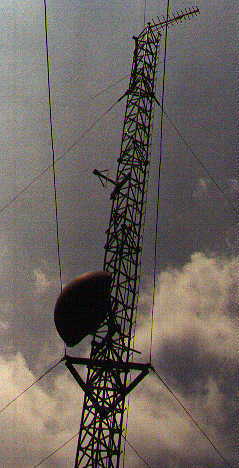 About mid-way up the Rohn-80 tower, the Arrow-shaped Shively 6500-1R (Serial Number 1) antenna is side-mounted to provide the extra directionalization needed to protect the NRAO observatory in nearby Green Bank, West Virginia.It looks like a hunting bow stuck to the tower, but it's actually a very effective directional broadcast antenna! This antenna delivers the most directional FM signal pattern in the United States (26.62 db null) for WVLS-FM, Monterey, Virginia. WVLS operates as a Class B1 station with 360 watts ERP from a height of over 4600 feet above sea level.