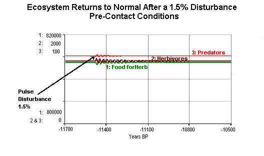 Graph Ecosystem Returns to Normal after a Disturbance of 1.5%, shows the effect of a pulse reduction in predator population and demonstrates the dynamic stability of the model