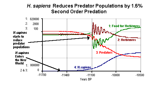 H. sapiens begins to reduce predator populations 400 years after coming to the New World by 1.5%. This is based on the reasoning: