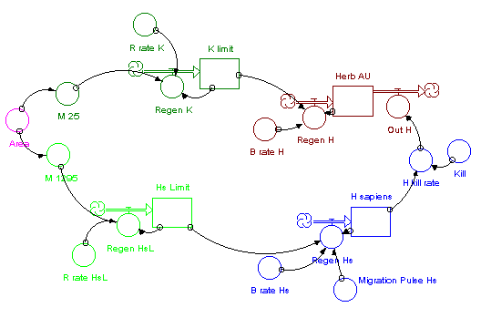Each of the diagrams is the same save for the addition of an outflow from the Hs Limit box and its controller in Diagram 2. This represents the relationship between the death of herbivores, Out H, and the state of the carrying capacity of Homo sapiens, Hs Limit. In both diagrams the level of the Hs Limit box impacts the regeneration rate of Homo sapiens.
