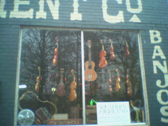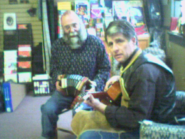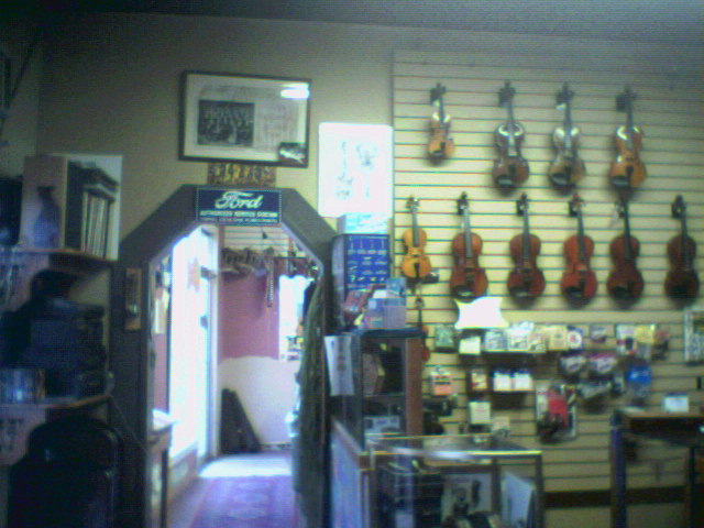 This is the front window at Homewood Music. They focus on acoustic instruments. There are luthiers in house as well as Bob pumping out the concertinas. Here we are inside Homewood music.This front room has fiddles (really nice ones!) and guitars. The cute doorway leads to the workshop where fiddles and concertinas are repaired and built. Here's Bob Tedrow at his