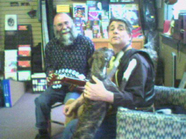 workbench.Bob describes his work building quality instruments as primarily a labor of love. He tells me he probably couldn't keep it up if he depended entirely on manufacture for a livelihood. Here Bob and I are jamming.I'm playing the Hayden Duet that Bob built. |