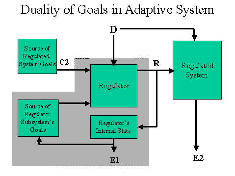 If there are no immediate effects on the regulator as a consequence of the regulator's choice of a less than best effect on the system, the regulator still may get feedback from the "Source of Regulated System Goals." This feedback may come in terms of information (C2), or in terms of physical and emotional consequences, impact on the regulator's desired state (probably through D). Feedback through C2 will not alone change the regulator's behavior, since it has not impacted the rules by which the regulator operates. Indeed, if the regulator were to operate against its own best interests, it would cease to be a viable adaptive system itself. It will be effective only if the choice was due to ignorance on the part of the regulator. If the feedback through D is not forthcoming, is inappropriate, or is separated too long in time from the regulatory choice, appropriate adaptation of R in terms of the goals of the system (E2) will not be possible.