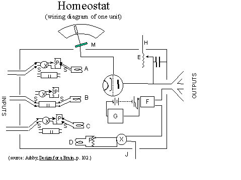 The original homeostat consisted of four identical units, supplied with DC current, and connected so that the input for each unit consisted of the output from the other three. Each input to each unit was modified by a commutator and a potentiometer which controlled the polarity and strength of the incoming signal respectively. The amount of current reaching each unit was measured by an indicator needle whose stable (or preferred) position was a narrow zone near the center of the dial. The output of each unit was proportional to the distance of the indicator needle from the center position. When the needles of a unit were centered, the current values of the potentiometer/commutator remained unchanging. When the needle diverged from its central position, a relay was closed which energized a mechanism to randomly assign, at 3-second intervals, new values to each of the potentiometer/commutator elements of the unit until the needle returned to its central position. (See figure 1)