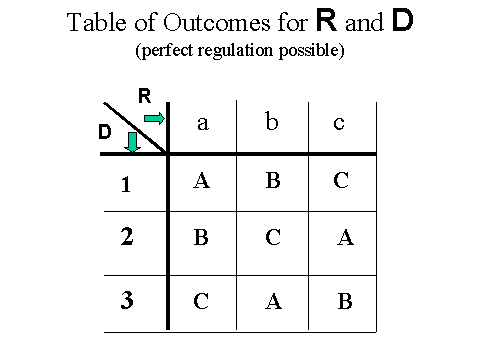 In this case, we can see that perfect regulation is possible. Suppose we wish to maintain an outcome of "C". If D=1 then R chooses c. If D=2, R chooses b; If D=3, then R chooses a. The same sorts of moves will be possible if R is controlling for an outcome of "A" or "B" as well.6