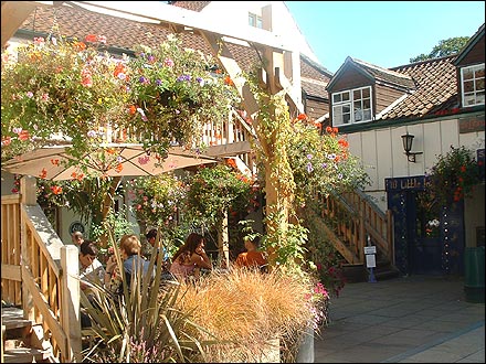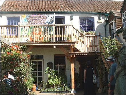 ![]() Inside the Glastonbury Experience. Cafe on left (it's behind a used book store), shops on right and ahead, library through blue gates, Goddess Temple on second floor up the stairs, spiritual school upstairs above bookstore. Wonderful any time of day! |