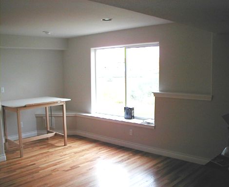 Tim's office. ![]() This photo was taken looking back from the right hand corner of the room. Just out of the frame to the left are the french doors. In the far corner is a little triangular bench. I love the different ledge levels in this room. As you might be able to see by the window, this is a walkout basement. This means that the basement is on ground level, rather than being underground. There are double doors on the other side where you can actually walk directly out to the backyard. The great advantage to this is that you can have standard windows and all kinds of light -- you don't have the feeling of being down in a basement at all. ![]() The basement bathroom. The shower is done in the same tile
