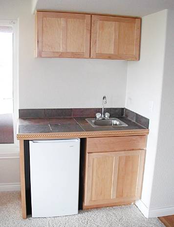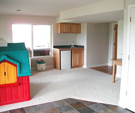 Room![]() To the right of the photo is the edge of the french doors into the basement bedroom. This room is currently being used as a child's playroom, but will most likely become my crafts room (I get a crafts room!) Outside of the window is the current owners' hot tub, which will be going with them. Maybe someday we'll replace it with one of our own. There is also a window on the wall to the left of the photo (out of the frame). The slate tile in the foreground is the entryway from the sliding glass doors to the backyard. (Geek Moment note: I took a digital photograh of this slate tile floor and modified it into the background for these web pages.) The door to the immediate right leads to the furnace, the water heater, and a small storage space. ![]() A close-up of the wetbar. The countertop is the same slate