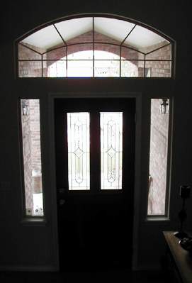 The front door is enhanced with beveled cut glass and framing windows that let