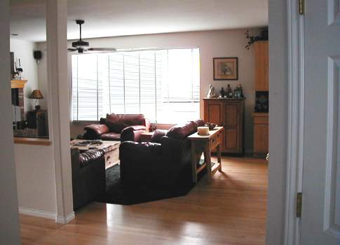Family Room![]() The brick built-in holds a gas fireplace, a TV and a component set. Above the fireplace is another accent wall at the back of a display niche. The hardwood floor was cut to accommodate a set-in carpet. Against the light wood of the floors and kitchen and the light of all the windows, the richness of the red brick and deep green (look, Mom -- more green!) add a richness and a cosiness to the room. Behind the couch on the left you'll see the half-wall that separates the family room from the hallway, yet leaves the sense of open space. ![]() This is taken from the angled hallway to the left of the entranceway and front door. On the very right side of the frame is the door leading down to the basement, and the left side shows off the half wall defining that side of the family room. I love the angles they cut in the floor for the carpet! The big windows directly across look out over the Front Range mountains.