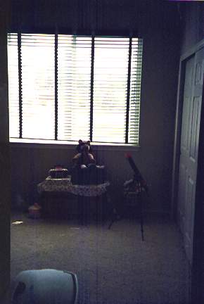 Okay, this is a horrifically awful photograph. I didn't have the flash on, my scanner is on the blink so everything's scanning with vertical lines running through it, and it's a tough room to take a photograph of because of the angle of the room. So I guess this is just here to say "Look! There is an office downstairs! It has a window and a closet!" Oh well.