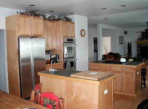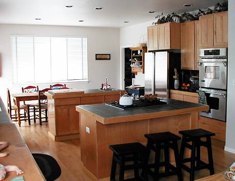 Kitchen![]() The kitchen includes extra tall maple cabinets, beautiful countertop tile, an eat-in nook facing a window, and two islands! As you'll see later, the family room is actually kind of an extension of the kitchen, so the two are totally open to each other. The cook can still be part of the party! The sliding doors to the deck are off of the nook -- just beyond the right side of the photo. ![]() All the appliances are that modern brushed stainless steel look, which actually looks really cool mixed in with all the wood and tile. We negotiated for the refridgerator in our offer since it matched everything else so well. The oven controls are all digital and look a bit daunting to my dial-trained eyes, but I'm sure we'll learn. The closest island has a veggie sink with a disposal (the owners assure us that this is great for quick transfer from fridge to sink), and the second island has the range. It's gas (hallelujah!) with two burners on one side and a gas-powered grill on the other. In the background, you can see bits of the family room. You'll notice too that all the lighting is recessed and placed to ensure that there's always light on all the workspaces. ![]() This view is looking back towards the eat-in nook from the family room side of the kitchen. You can see that this side of the second island is built so that it could also double as an informal breakfast bar. The doorway towards the back on the right leads into a walk-in pantry. | ||||