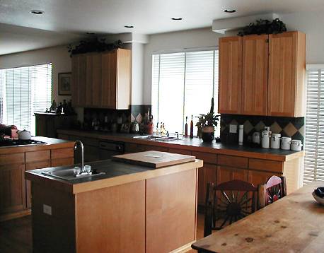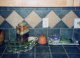 This is a close up of the beautiful tile throughout the kitchen, including the backsplash. The same tile is used on all the counters and on both islands. Look, Mom! It's GREEN! | ||||