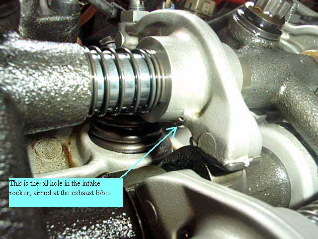 Photo of the additional hole drilled in the intake rocker to lubricate the exhaust lobe of the camshaft