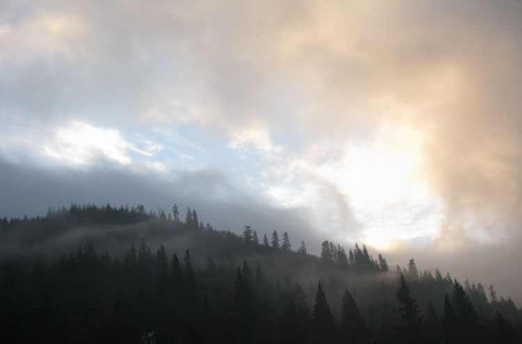 Low clouds and mist cling to the mountainous slopes above Dunsmuir,