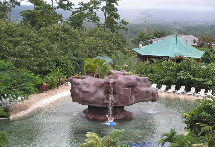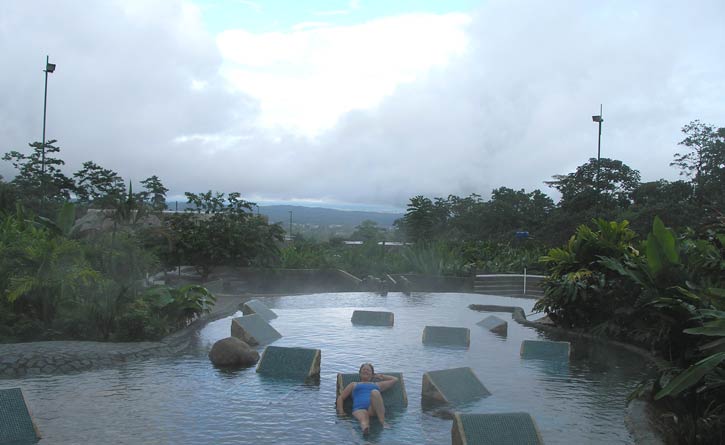 There are two main hot springs resorts for tourists: Baldi and Tabacon. Both were fairly uncrowded when we visited -- again, it was the low season. Both are fabulous, and each has its own atmosphere. Baldi is like Las Vegas. There's a heliport pad in the middle of the grounds, for heaven's sake! The pools are large and the surroundings flashy, inviting a party mood and reminding you that you're frolicking in a luxurious, man-made, aquatic playpen.
