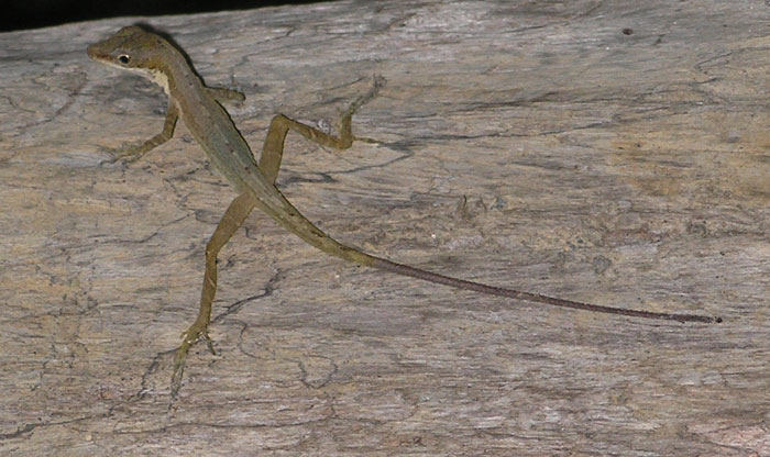 | An anole lizard -- these little guys (about the size of a brand new number 2 pencil) have big throat sacs that they inflate to scare away other little anoles who might invade their territory. |