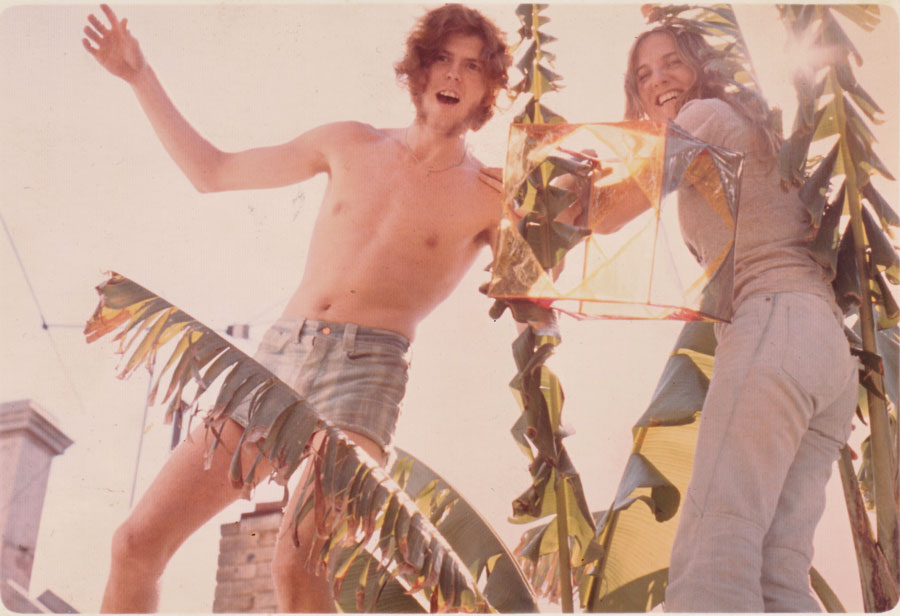 Same house, forty years earlier; Paul stands on the window ledge, Pam
