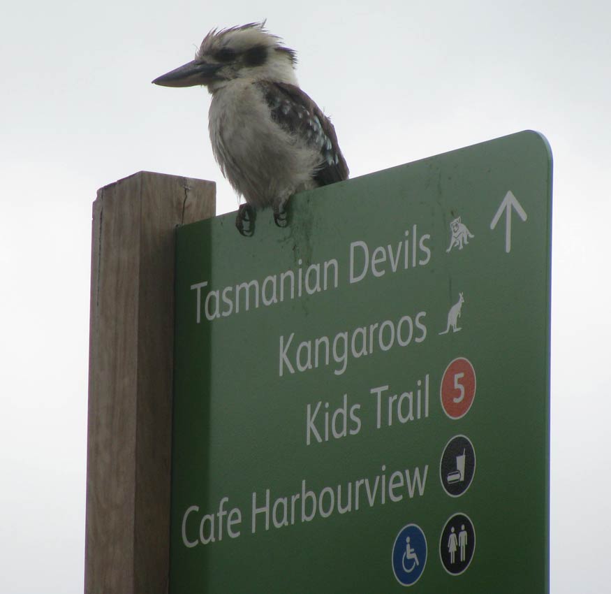 A wild kookaburra poses atop a zoo sign