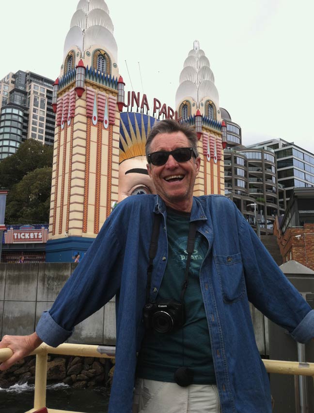 David, on a ferry with Sydney's iconic Luna Park entrance behind him