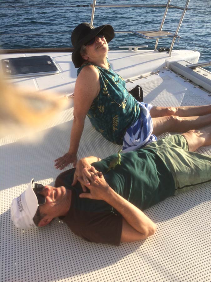the catamaran's trampoline, enjoying the 90 minute sunset ride back