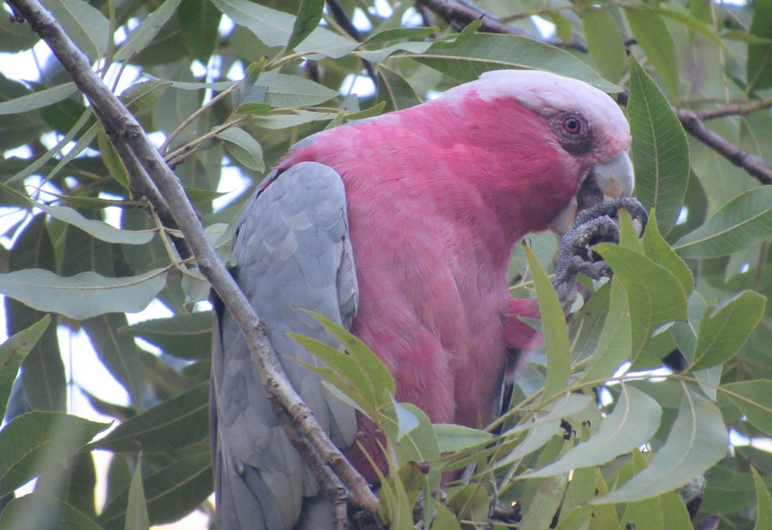 wild birds with strong beaks. This galah lands in the tree just overhead