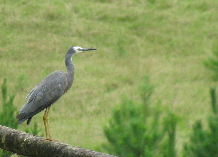 A white-faced heron roosts on the top of the fence around the clay