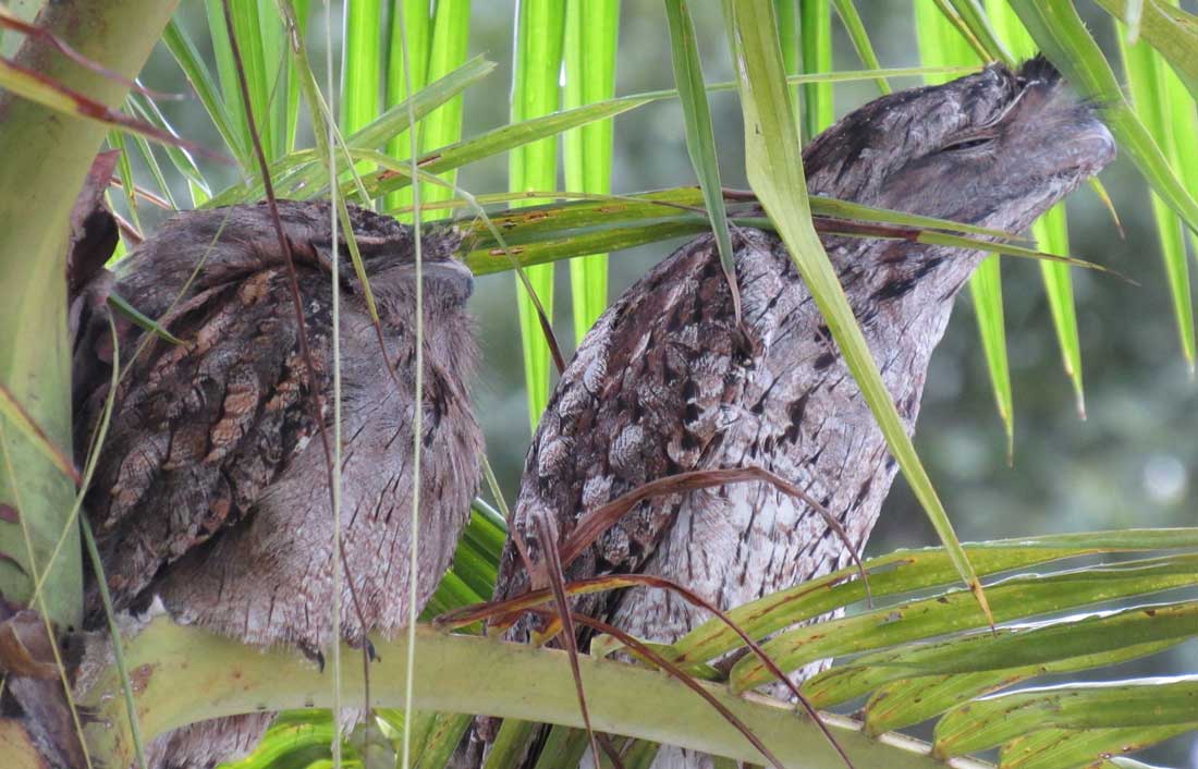 My favorite sighting is of a pair of tawny frogmouths, an owl-like bird