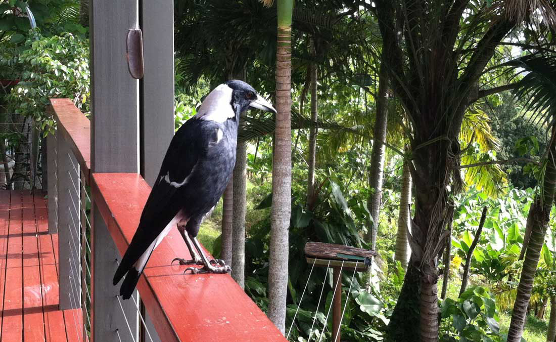 The magpies on the banana farm are totally used to people. They greet