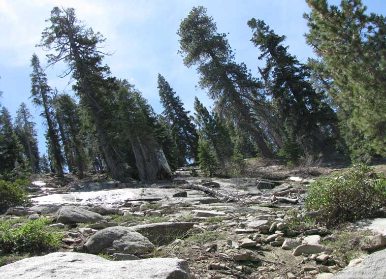 The switchback trail up the mountain winds through granite and evergreens.